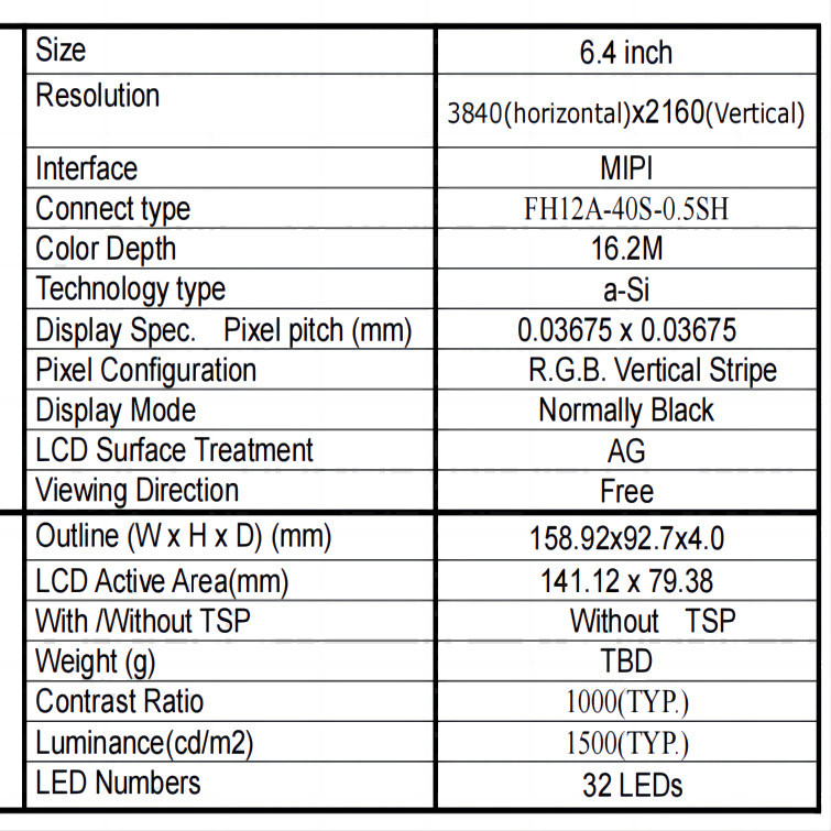 ESHX064UHD представляет собой 6,4-дюймовый высокорезолюционный TFT LCD дисплей с разрешением 3840 * 2160 и интерфейсом MIPI, угол обзора полный, яркость 1500 c/d